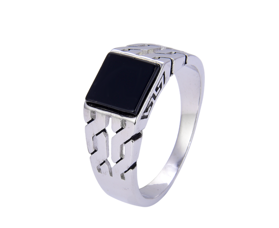 הטבעת הזו מעניקה לגבר מראה קשוח ואיכותי. אבן אוניקס שחורה יושבת במרכז ויוצרת ניגוד מרשים מול כסף 925 בעל גימור נקי. הדוגמה שבצידי הטבעת מוסיפה עומק ואופי ומדגישה את הסגנון הייחודי שלה.