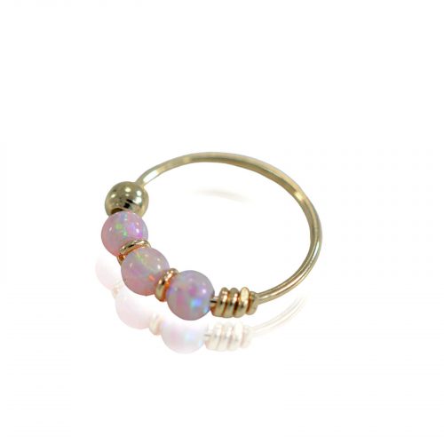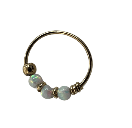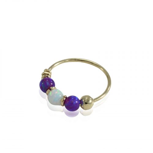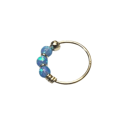 הוסיפי נגיעה של עומק וזוהר מסתורי למראה שלך עם פירסינג חישוק זהב 14K אופל כחול כהה. החישוק עשוי זהב 14K איכותי ומעוטר בשלושה חרוזי אופל בגוון כחול כהה המנצנצים בכל תנועה. זהו תכשיט ייחודי בעל נוכחות מרשימה, המתאים באופן מושלם לנזם באף או כעגיל לאוזן. החישוק היפואלרגני לחלוטין, עמיד במים ומתאים לענידה יומיומית רציפה ובטוחה.